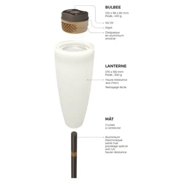 Peut s’utiliser de plusieurs manières : Bulbee ou lanterne accroché à l’aide de la lanière en cuir, planté dans le sol à l’aide du piquet, posé sur la table ou au sol, sur son embase ou sa pince de table.